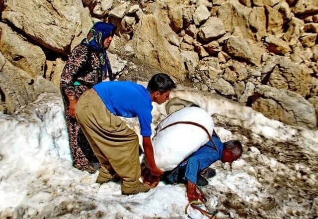 وی اضافه کرد: آنها برای اینکه این برفها دیرتر آب شوند، آن را «پرژین» میکنند، به این معنا که روی برفهایی را که داخل این ظروف چوبی بزرگ ریختهاند را با گیاهان خوشبویی همچون «چنور» و «کما و لو» و یا ترکههای بلوط می پوشانند و در پایین دست این حفره چوبی، قم (ظرف مخصوص آبشخور دامها) را قرار میدهند تا آبی که به مرور در داخل کنده آب میشود داخل آن ریخته شود و دامها بتوانند از آن آبشخور کنند.