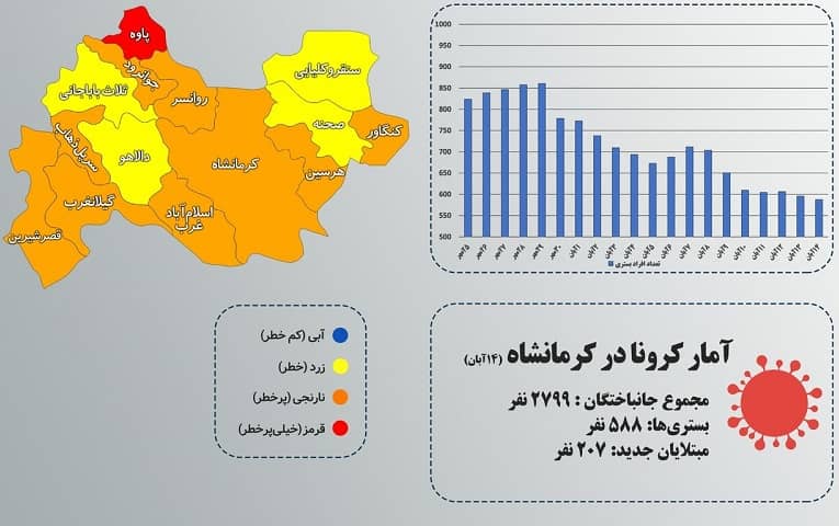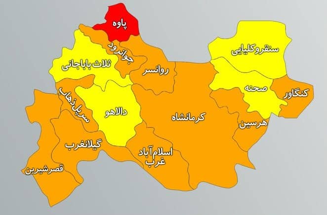 به گزارش آوای باینگان، «مهدی محمدی» روز شنبه در گفت و گو با ایرنا افزود: براساس رنگ بندی ۱۲ آبان وزارت بهداشت، درمان و آموزش پزشکی سه شهرستان استان کرمانشاه در وضعیت قرمز قرار داشت که از امروز شهرستانهای سرپلذهاب و روانسر به وضعیت نارنجی و شهرستانهای صحنه و سنقر و کلیایی نیز از نارنجی به زرد تغییر رنگ دادند.